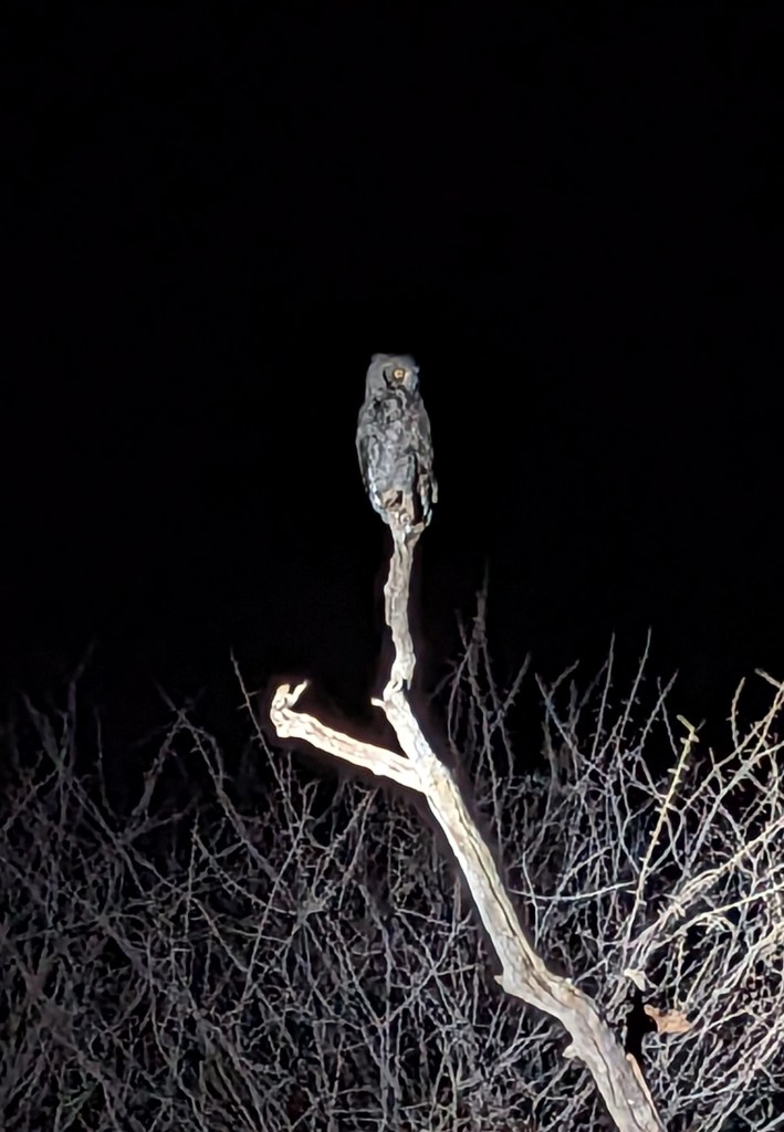 We also saw a couple of new bird species, a black winged kite and golden breasted bunting. Towards the end, as usual we stopped for our ‘sun downers’ (drinks and snacks) from ‘Charlie’s bar’ and then drove back to the lodge in the dark looking for nocturnal animals. On our way back we saw a Spotted Eagle Owl sat on the top of a branch.
