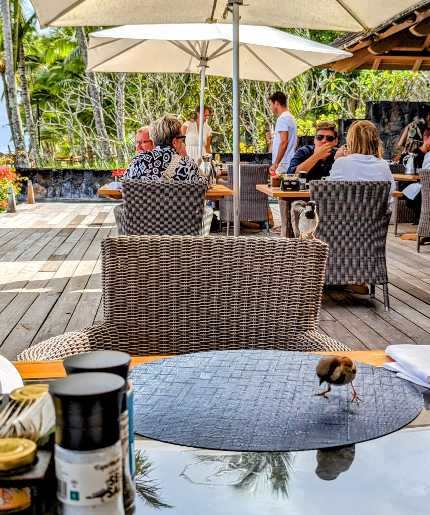 We went for an early-ish breakfast at La Caravelle restaurant as this morning we were going to play golf as Harry’s birthday prezzie from me. The view from breakfast was lovely and some little birdies decided to try their luck to see what they could find for their breakfast.