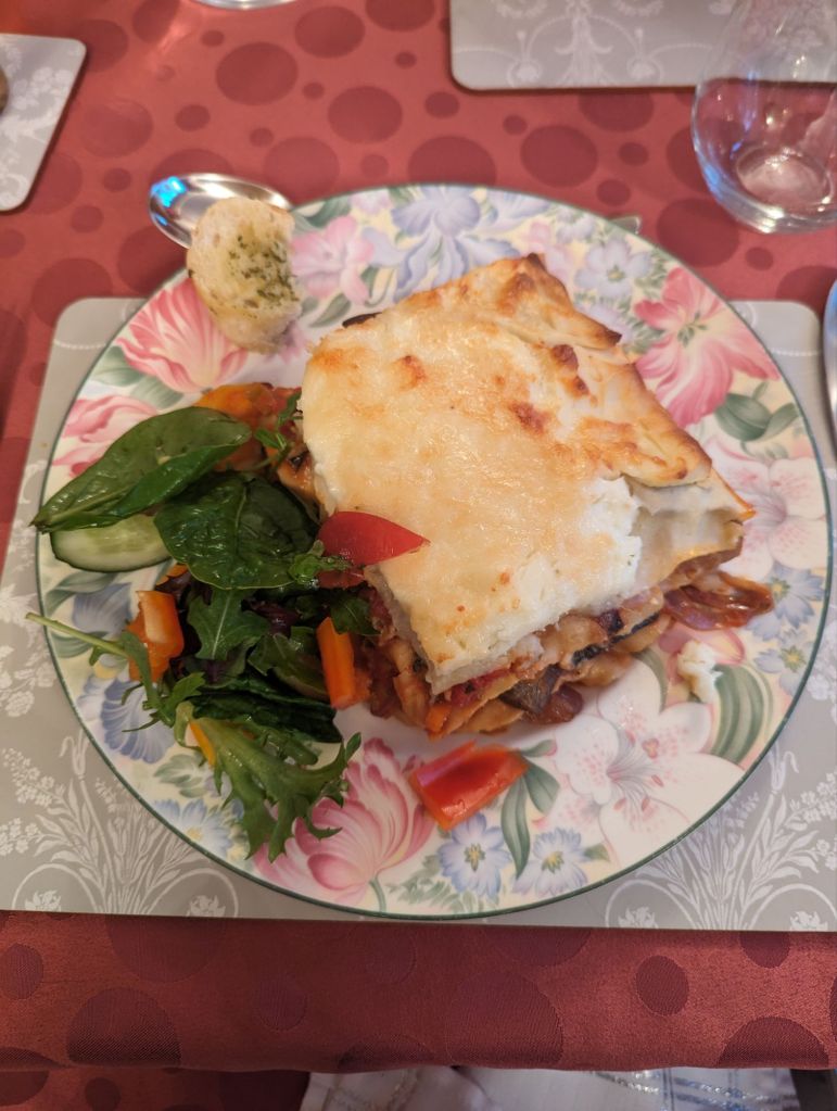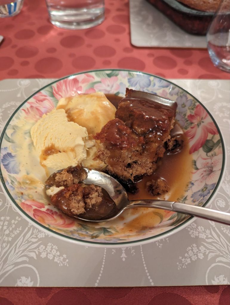 It was then time for dinner, which we’d been looking forward to for the first half of the trip as we’d heard we were being fed home made lasagna with garlic bread followed by Sharon’s famously good sticky toffee pudding and oodles of sticky toffee sauce. Well, they both loved up to expectations and beyond – it was all delicious and the portions definitely filled us back up after our long cycle today!