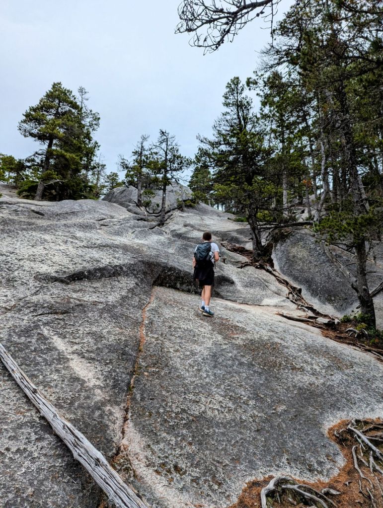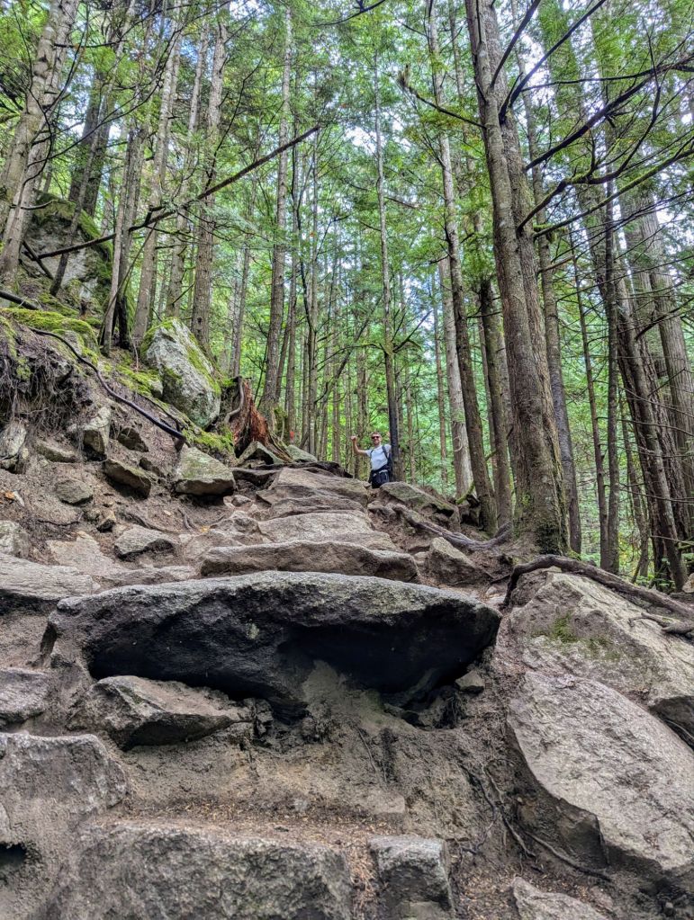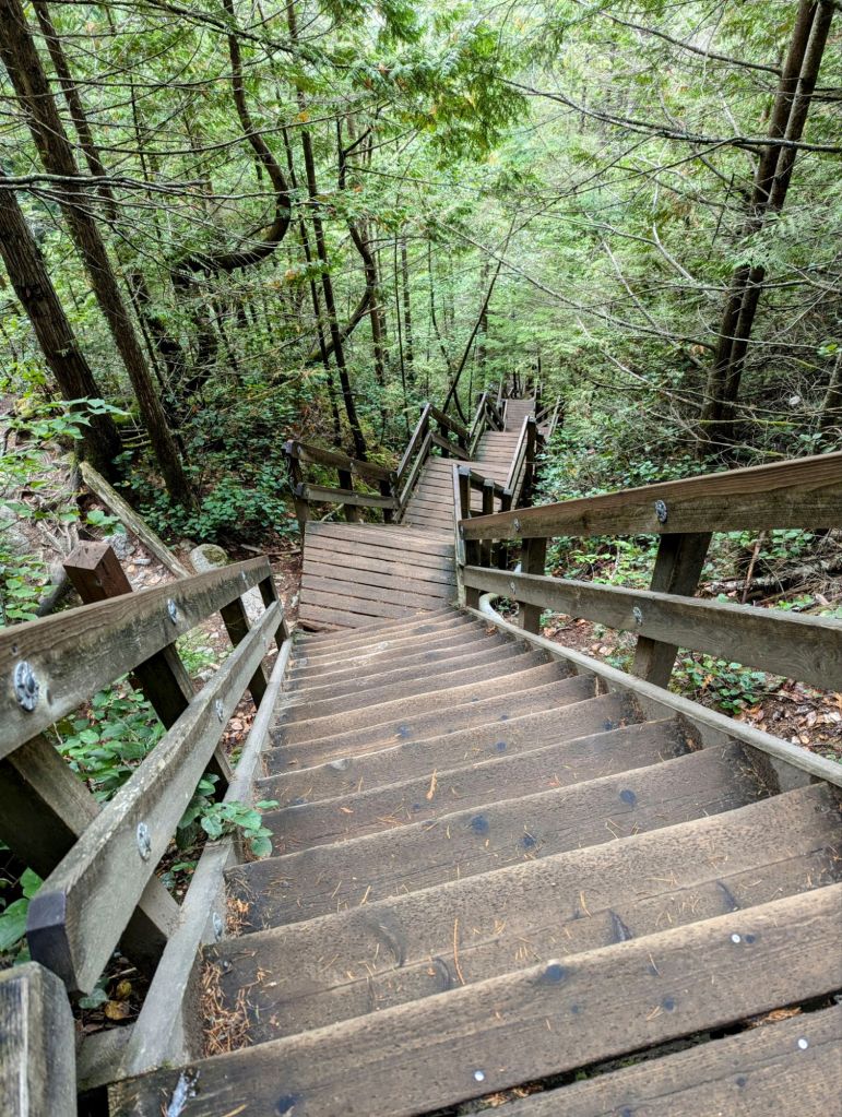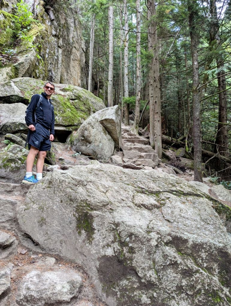 The walk began through the campsite – crazy people camping in bear territory! And then came the ascent, which started off mainly as man built wooden stairs – they were a real workout…