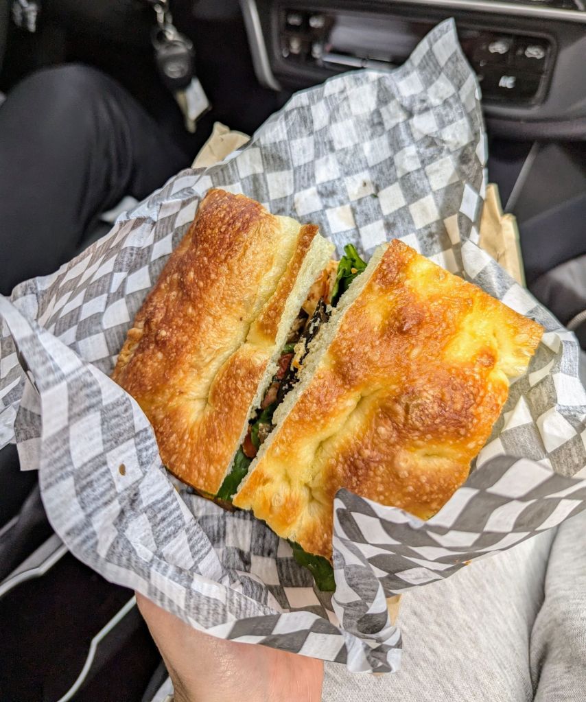 There was some beautiful scenery along the way that kept us occupied. We first stopped around 1pm just in a lay-by on the side of the road (as there weren’t many actual stopping places because we were quite remote now). But this lay-by had a lovely view that we could admire while we ate our packed lunch (a focaccia sandwich) that we had picked up from the Purebread bakery.