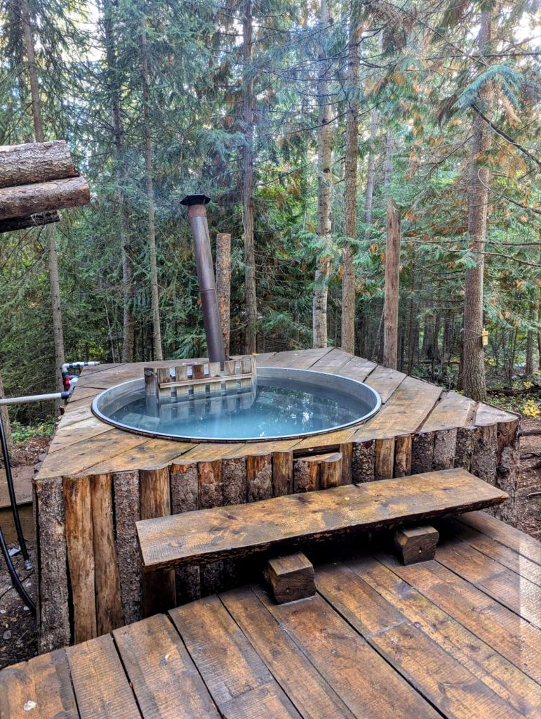 We first used the hot tub (powered by a log burner) to warm ourselves up – it was so lovely!