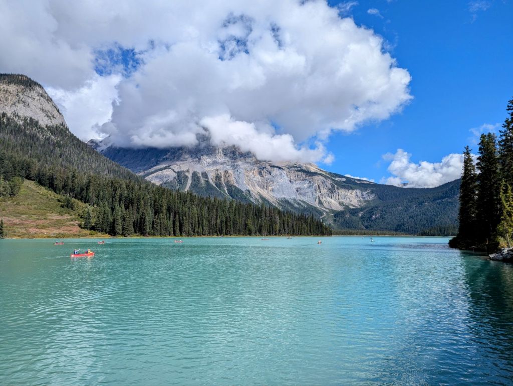 After breakfast we packed up our bags and said goodbye to Michael and the nice couple we had met last night and got in the car and back on the road. We headed for Yoho National Park, on the Trans Canada Highway, where we were going to stop off at Emerald lake. We arrived and there was a huge queue for the car park, so Harry stayed in the car while I just jumped out to take a few photos. It was pretty and definitely more of an emerald colour compared to some of the other lakes!