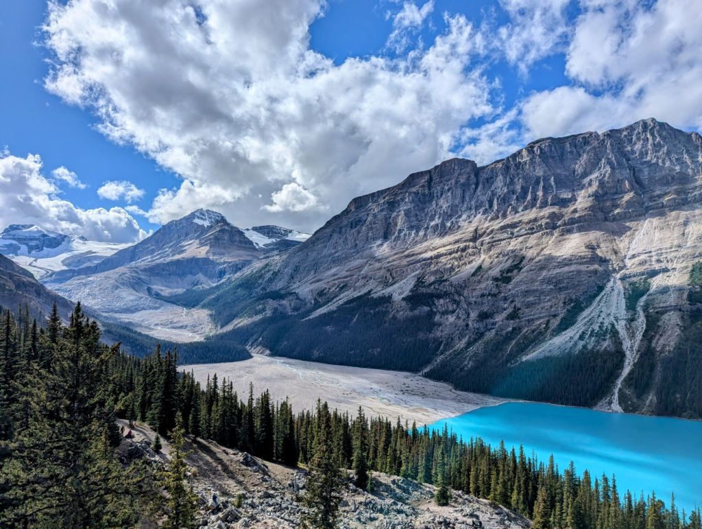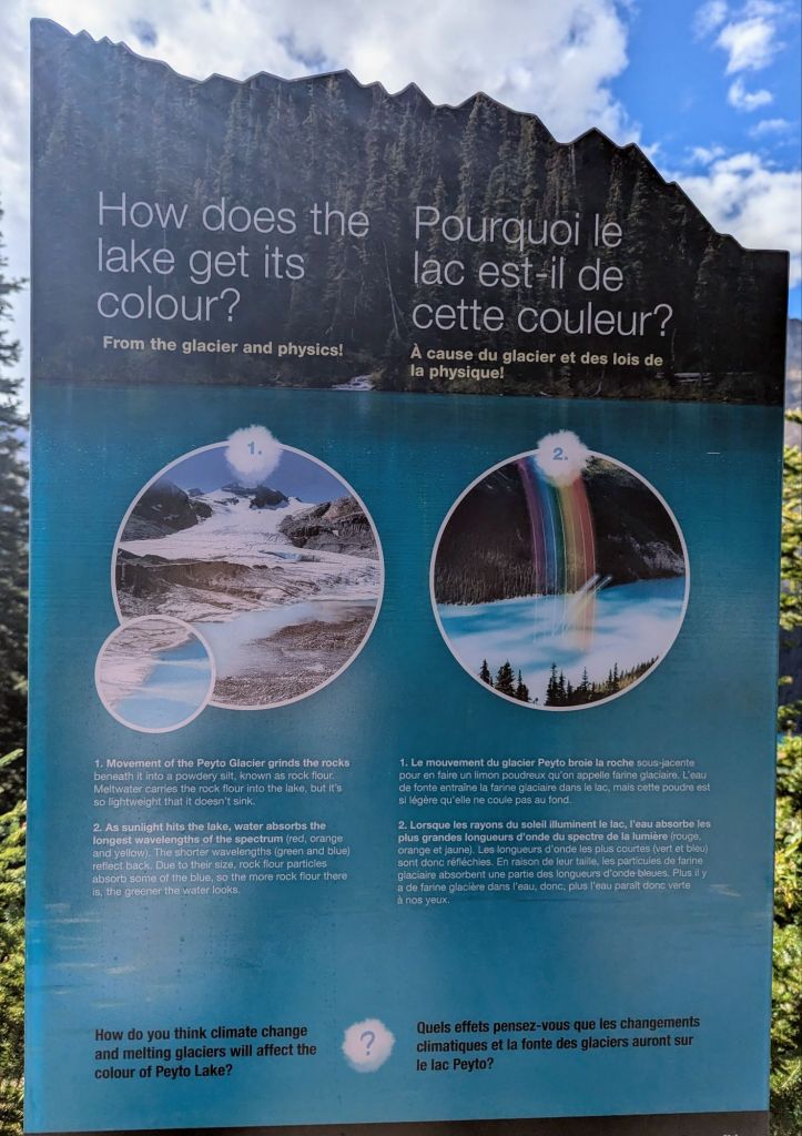 Our next pull over was Peyto lake. We parked the car and walked a short way uphill to the viewpoint.