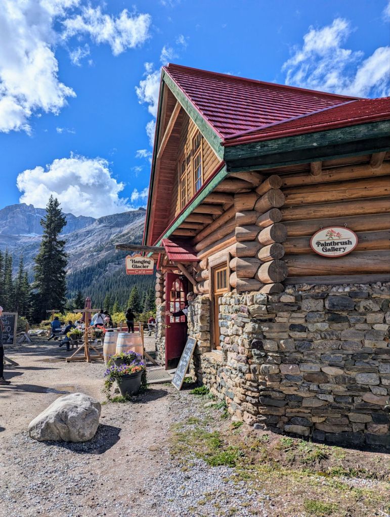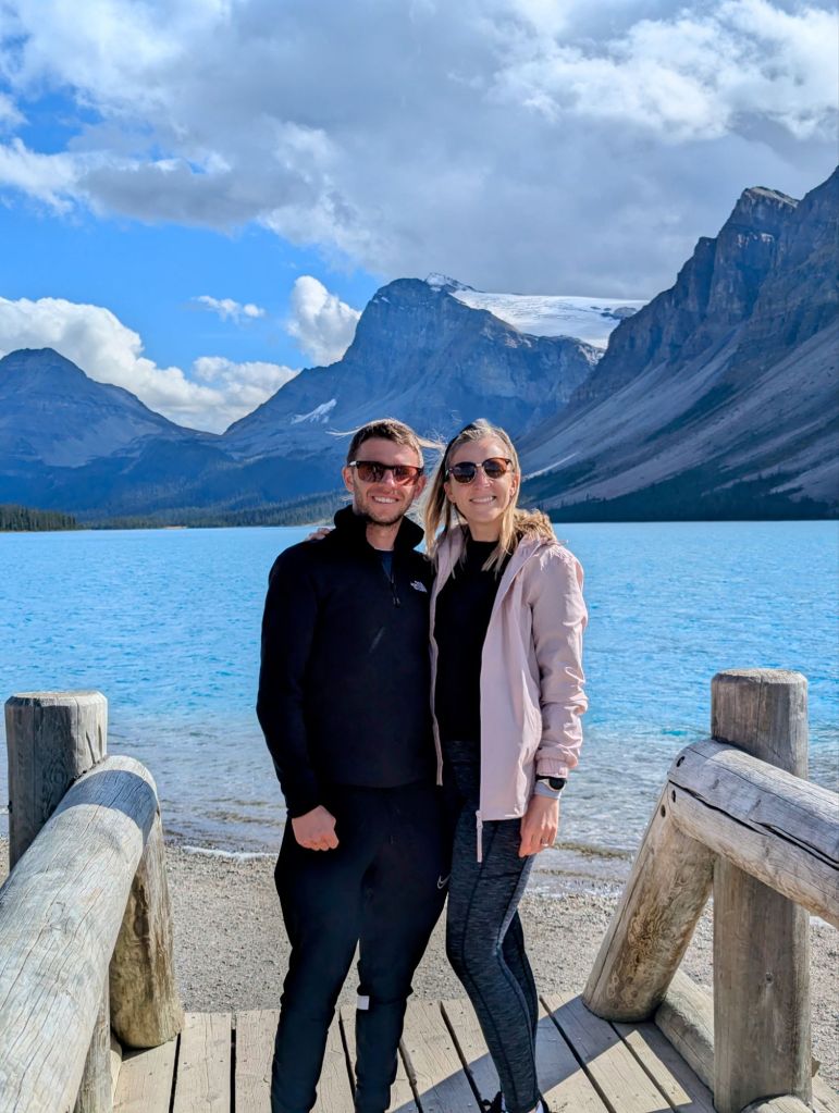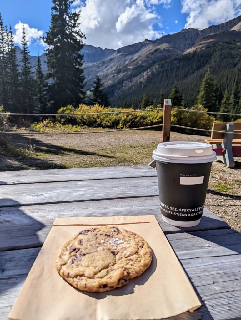 We started our drive back down then Icefields parkway – we weren’t going any further up the road as a lot of the viewpoints were closed following the Jasper wildfires and it apparently looks very black and sad up there. On our way back down we pulled into another Bow Lake view point. We parked the car and got out for a walk around. We popped into the cafe at Bow Lodge for a cuppa and sweet treat to share.