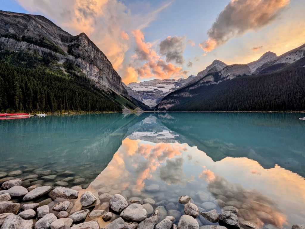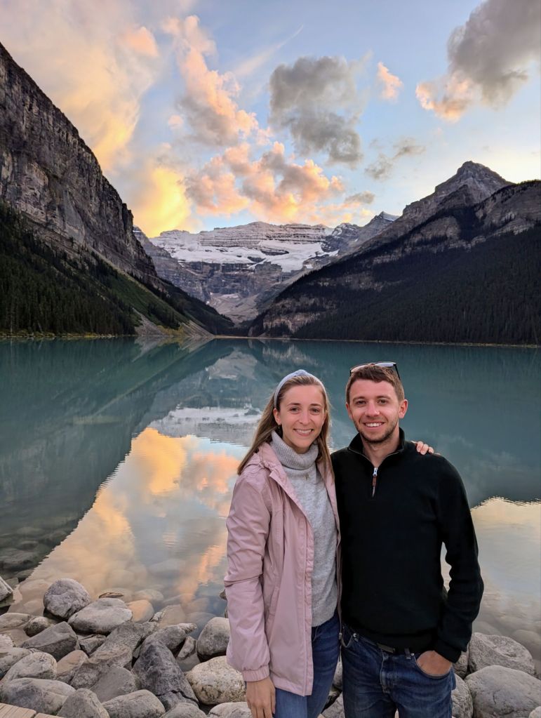 As it was still light, we thought we would drive to Lake Louise (the actual lake) for dusk (even though we were going tomorrow) just to see what it was like at a different time of day, and hopefully when it was less busy. The colours reflected from the sky in the lake were so beautiful and it was really serene and peaceful.